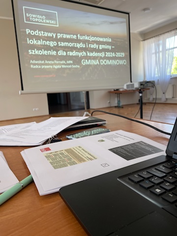 13 maja 2024 r. w Gminie Dominowo adw. Aneta Fornalikr. pr. Agata Wencel-Socha przeprowadziły szkolenie „Podstawy prawne funkcjonowania lokalnego samorządu i rady gminy” dla nowo wybranych radnych.