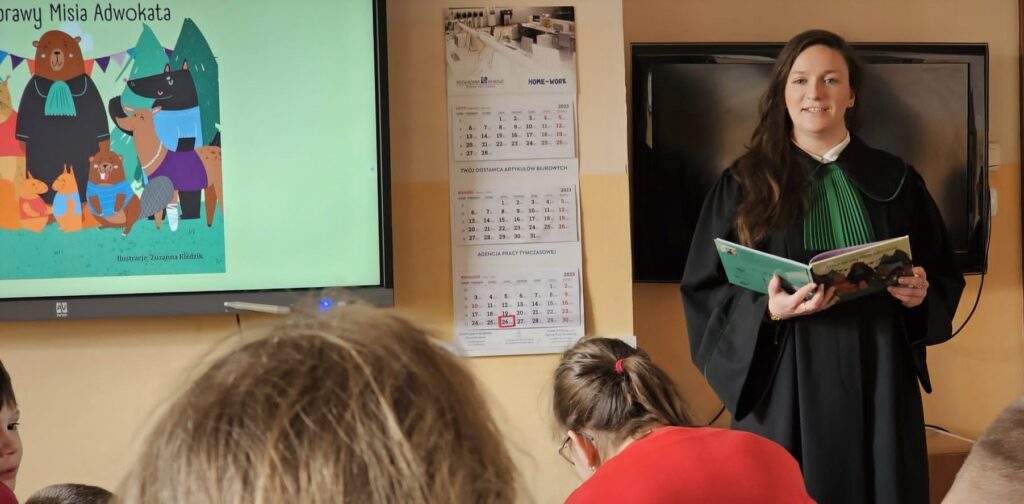 Podczas spotkania Pani Mecenas opowiedziała historię opisaną w wydanej w ramach akcji książce pt. „Leśne sprawy Misia Adwokata”, przekazała także uczniom tematyczne materiały.