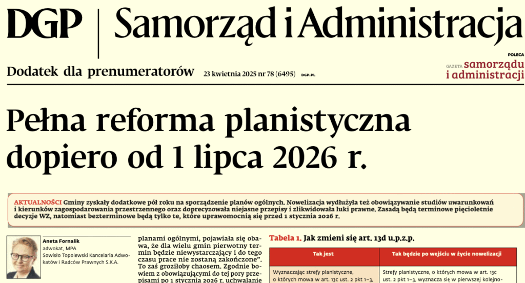 Artykuł „Pełna reforma planistyczna dopiero od 1 lipca 2026 r.” przedstawia, jakie zmiany w przepisach czekają gminy i dlaczego ich pełne wdrożenie w ramach reformy planistycznej zostało przesunięte na połowę 2026 roku.