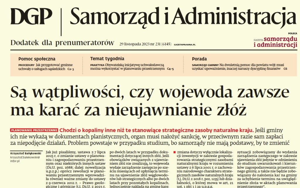 1. Artykuł autorstwa adwokat Anety Fornalik i radcy prawnego Aleksandry Urbanowskiej-Bohun „Przepisy nie dają możliwości zmian w studium w celu ujawnienia złóż”.