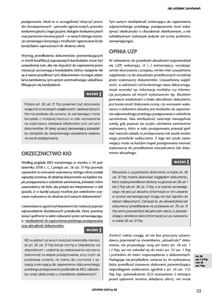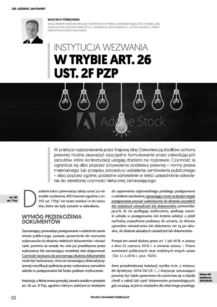 „Monitor Zamówień Publicznych” – jeden z najbardziej prestiżowych periodyków w zakresie zamówień publicznych – w wydaniu listopadowym 2019 (nr 10) opublikował artykuł mec. Wojciecha Piórkowskiego — Dyrektora Departamentu Prawa Zamówień Publicznych, dotyczący instytucji wezwania w trybie art. 26 ust. 2f ustawy Pzp.