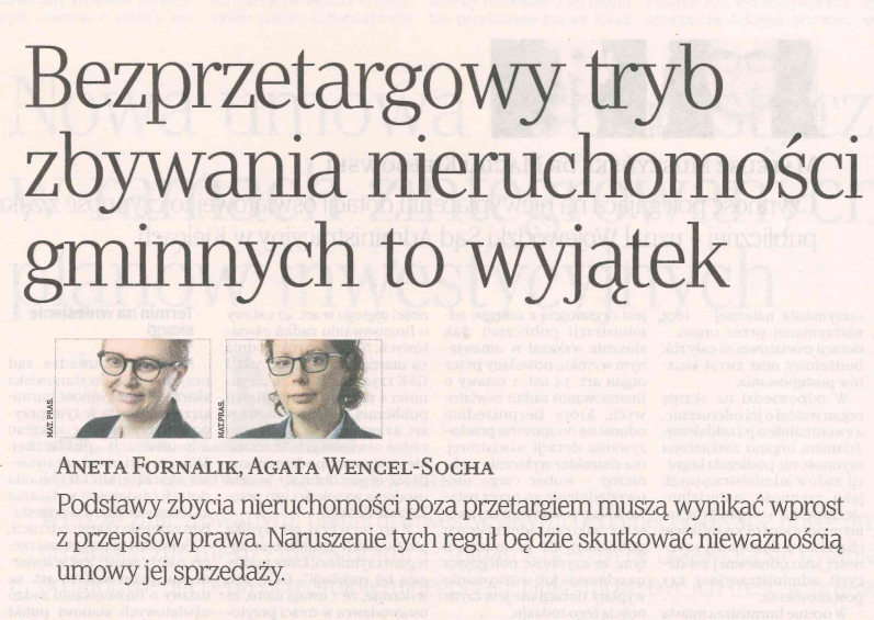 W dniu 2 października 2024 r. w jednym z najbardziej prestiżowych dzienników w Polsce, Rzeczpospolitej, został opublikowany artykuł „Bezprzetargowy tryb zbywania nieruchomości gminnych to wyjątek” autorstwa adwokat Anety Fornalik i radcy prawnego Agaty Wencel-Sochy. To pierwsza wspólna publikacja na łamach tego dziennika, w dodatku poświęconym Administracji w nowej odsłonie.