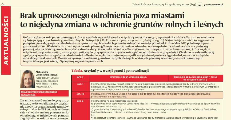 Dziennik Gazeta Prawna w swoim dodatku „Samorząd i Administracja” (nr 221) z dnia 15 listopada 2023 r. opublikował artykuł „Brak uproszczonego odrolnienia poza miastami to niejedyna zmiana w ochronie gruntów rolnych i leśnych” autorstwa radcy prawnego Aleksandry Urbanowskiej-Bohun.