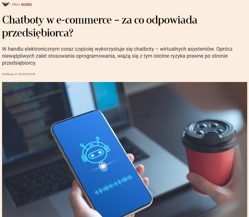 Coraz więcej firm wykorzystuje chatboty w sprzedaży online. To wygodne i nowoczesne rozwiązanie, ale czy bezpieczne prawnie? Autorki – adw. Marta Łojek i praktykantka Julia Balewska, w artykule opublikowanym w dzienniku Rzeczpospolita analizują, jakie ryzyka prawne wiążą się z korzystaniem z wirtualnych asystentów. Czy chatbot może przypadkowo złożyć ofertę? Kto odpowiada za jego błędy? Jak chronić dane osobowe?
