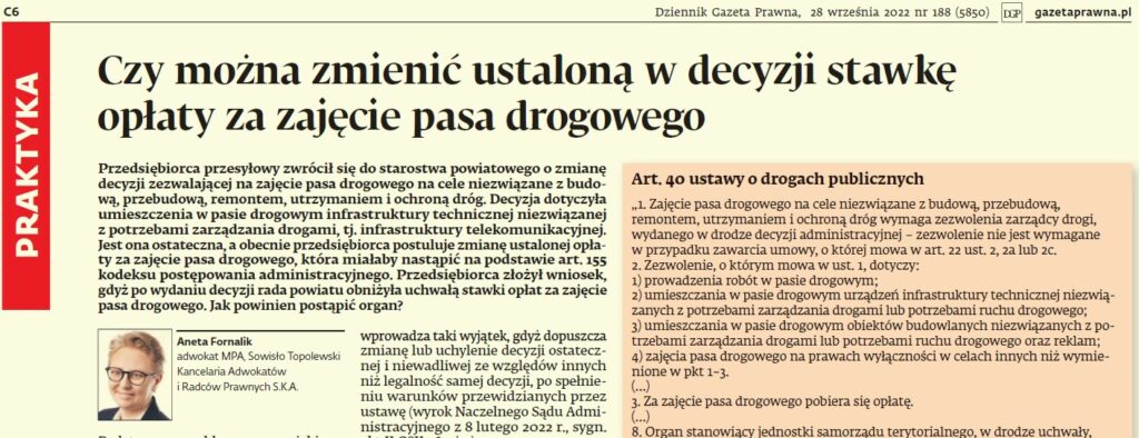 „Dziennik Gazeta Prawna” w swoim dodatku „Samorząd i Administracja” (nr 188) z dnia 28 września 2022 roku opublikował artykuł adwokat Anety Fornalik pt.: „Czy można zmienić ustaloną w decyzji stawkę opłaty za zajęcie pasa drogowego”.