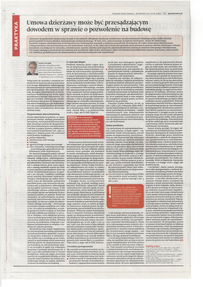 In der Beilage „Samorząd i Administracja” der Tageszeitung „Dziennik Gazeta Prawna” (Nr. 81/2021) wurde der Beitrag der Rechtsanwältin Aneta Fornalik „Der Pachtvertrag kann ein entscheidender Beweis im Rechtsfall über die Baugenehmigung sein“ veröffentlicht.