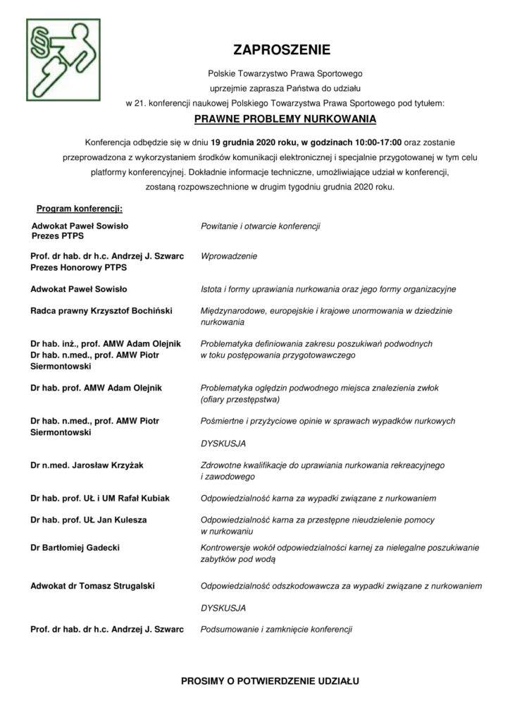 Die Polnische Gesellschaft für Sportrecht, desses Präsident der Rechtsanwalt Paweł Sowisło ist, veranstaltet die 21. wissenschaftliche (online) Konferenz zum Thema „Rechtliche Probleme des Tauchens”.