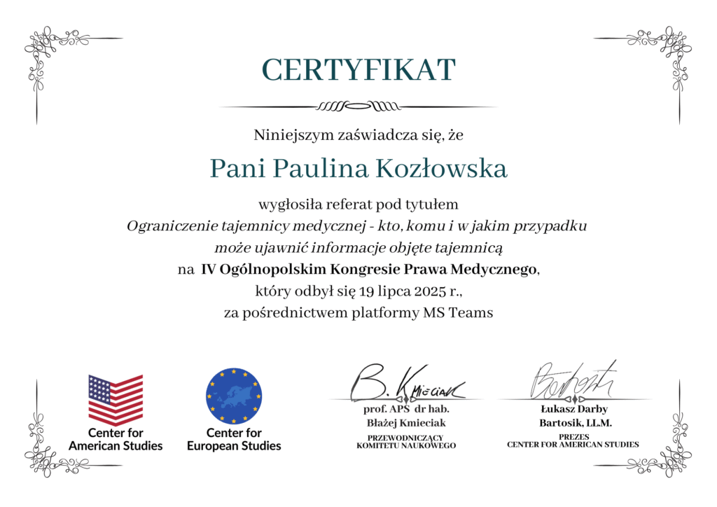 Representatives from our law firm participated in the event. Attorney-at-law Paulina Kozłowska gave a lecture titled “Limiting medical confidentiality – who, to whom and in what cases can disclose information covered by confidentiality,” while Marta Walkowiak presented a speech titled “The doctor’s responsibility for prescribing without medical indications.” Attorney-at-law Malwina Kasprzak was also present at the event.