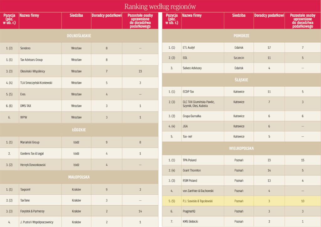 The ranking covers the entire tax advisory sector in Poland and is based on the number of tax advisors working exclusively at a given firm.