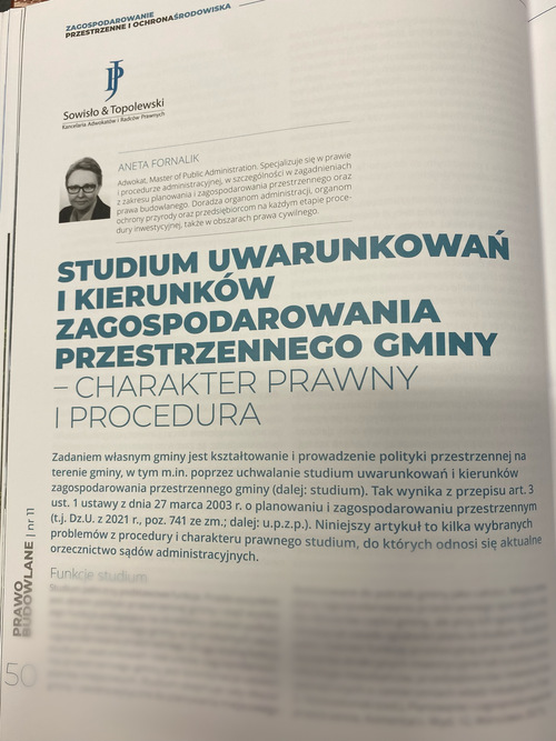 2) Article by barrister Aneta Fornalik: “Municipal Spatial Development Conditions and Directions Study – legal character and procedure”.