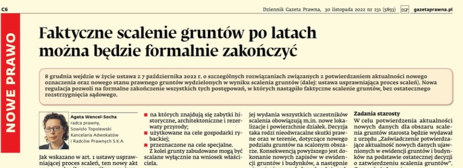 „Dziennik Gazeta Prawna” w swoim dodatku „Samorząd i Administracja” (nr 231) z dnia 30 listopada 2022 roku opublikował artykuł radcy prawnego Agaty Wencel-Sochy pt. „Faktyczne scalenie gruntów po latach można będzie formalnie zakończyć”.