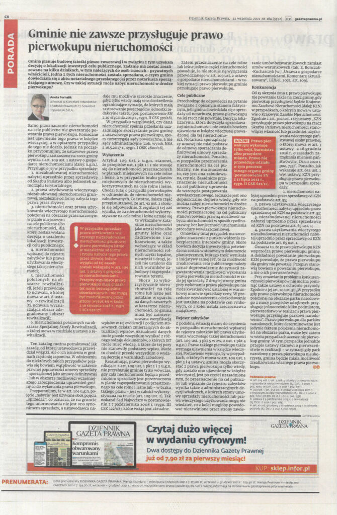 „Dziennik Gazeta Prawna” w swoim dodatku „Samorząd i Administracja” (nr 184/2021) opublikował w dnu 22 września 2021 roku artykuł pt.: „Gminie nie zawsze przysługuje prawo pierwokupu nieruchomości” autorstwa adwokat Anety Fornalik.