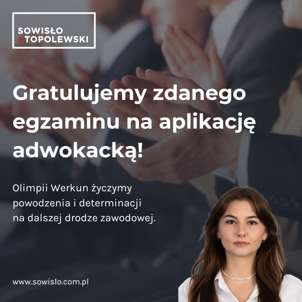 Z dumą przekazujemy informację, że nasze grono aplikantów powiększyło się o Panią Olimpię Werkun, która pomyślnie zdała egzamin na aplikację adwokacką.