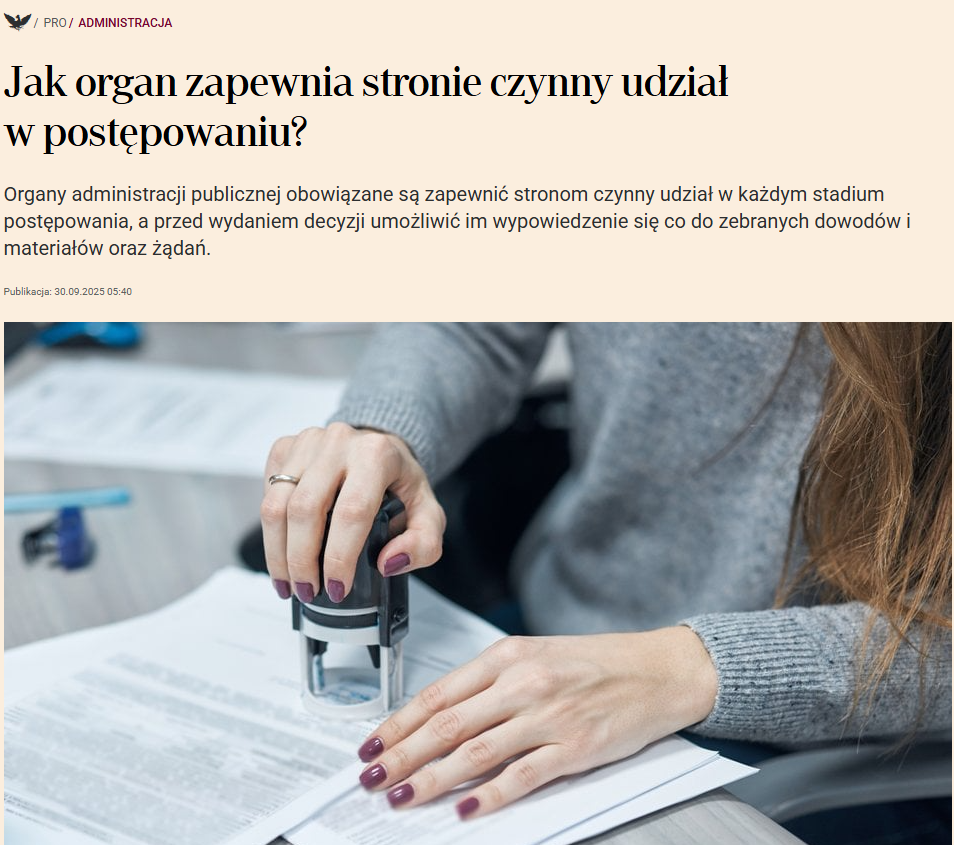 Na łamach Rzeczpospolitej adwokat Aneta Fornalik wyjaśnia, jak w praktyce wygląda realizacja jednej z kluczowych zasad postępowania administracyjnego – obowiązku zapewnienia stronie czynnego udziału w każdym jego etapie. W artykule analizuje m.in., czy organ zawsze musi wyznaczyć siedmiodniowy termin na zapoznanie się z aktami sprawy, kiedy można odstąpić od tej zasady oraz jakie skutki może mieć jej naruszenie.