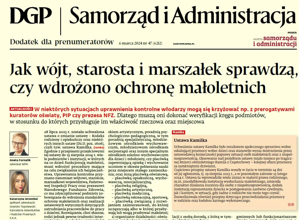 Dziennik Gazeta Prawna w swoim dodatku „Samorząd i Administracja” (nr 47) z dnia 6 marca 2024 r. opublikował artykuł „Jak wójt, starosta i marszałek sprawdzą, czy wdrożono ochronę małoletnich” autorstwa adwokat Anety Fornalik i aplikantki adwokackiej Katarzyny Wrembel.