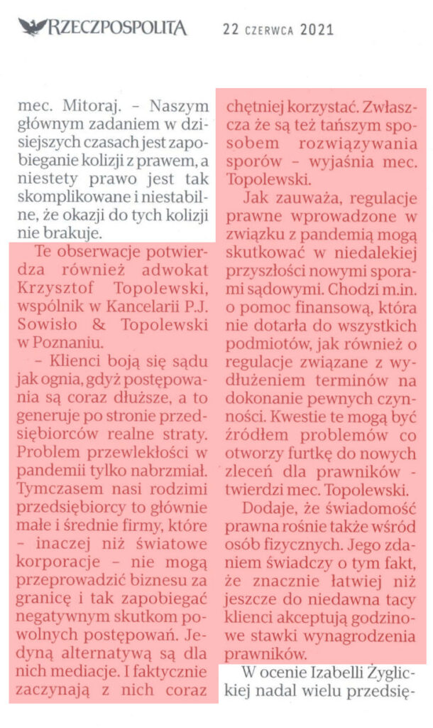 W części publicystycznej rankingu, wspólnik zarządzający, adwokat Krzysztof Topolewski, z punktu widzenia małych i średnich przedsiębiorców, skomentował postępujące cały czas wydłużanie się postępowań sądowych, wskazując na mediację jako rzeczywistą alternatywę dla procesów sądowych, celem szybszego rozwiązywania sporów gospodarczych.