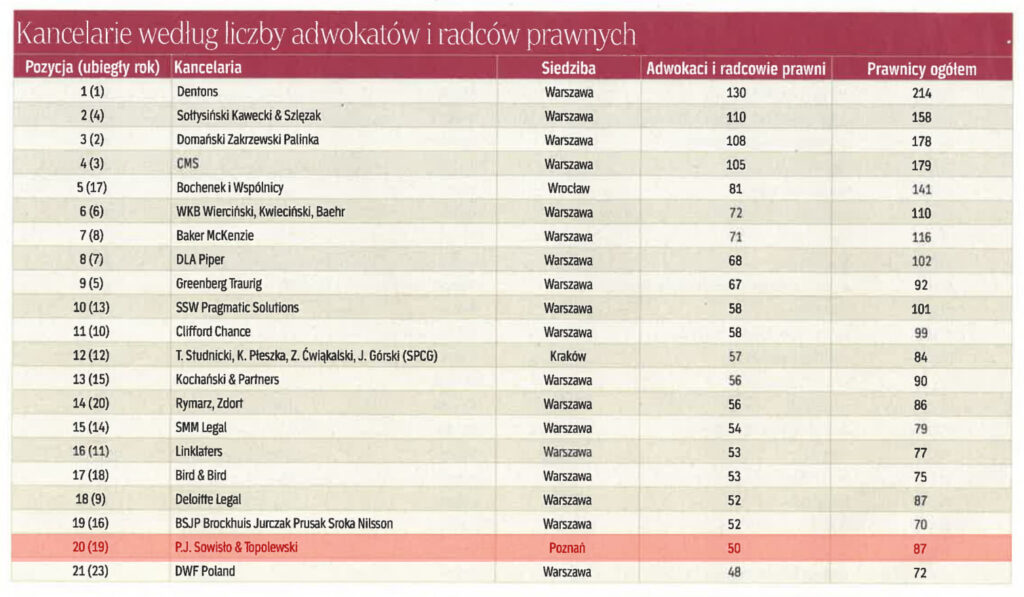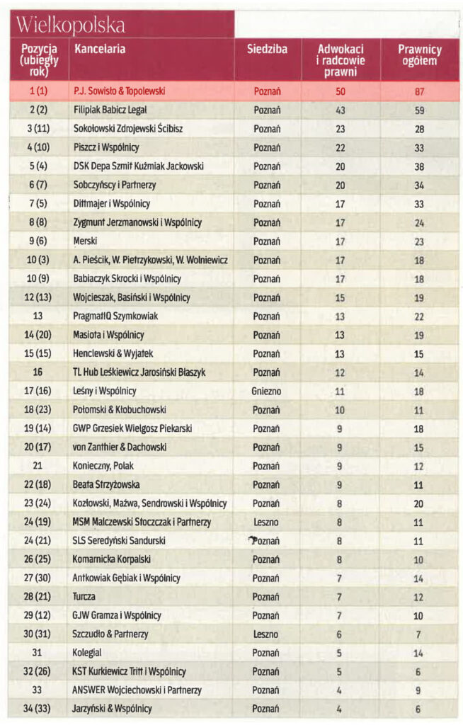 W najbardziej prestiżowym w środowisku prawniczym Rankingu Kancelarii Prawniczych 2021 dziennika „Rzeczpospolita” zajęliśmy 1 miejsce w Wielkopolsce oraz 16 miejsce w skali całej Polski pod względem liczby prawników ogółem pracujących dla Kancelarii na wyłączność. Z kolei pod względem liczby adwokatów i radców prawnych zajęliśmy 20 miejsce w skali całej Polski. W rankingu ogólnopolskim sklasyfikowano łącznie 305 kancelarie.