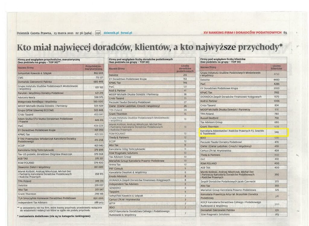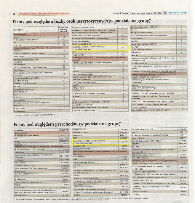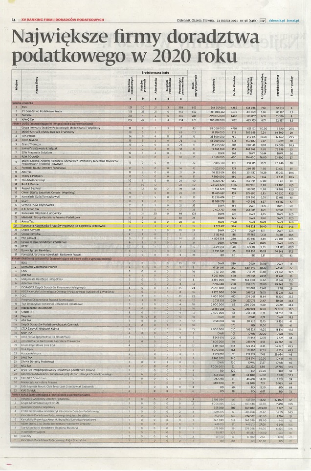 Z przyjemnością informujemy, że po raz kolejny „Dziennik Gazeta Prawna” zakwalifikował naszą Kancelarię do grona największych Firm Doradztwa Podatkowego w Polsce, co znalazło swoje odzwierciedlenie w XV Rankingu Firm i Doradców Podatkowych.
