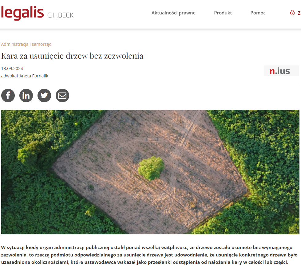 18 września 2024 r. ukazał się artykuł „Kara za usunięcie drzew bez zezwolenia” autorstwa adwokat Anety Fornalik w Serwisie Informacji Prawnej “Legalis”.