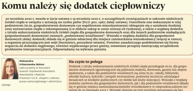„Dziennik Gazeta Prawna” w swoim dodatku „Samorząd i Administracja” (nr 198) z dnia 12 października 2022 roku opublikował artykuł radcy prawnego Aleksandry Urbanowskiej-Bohun pt.: „Komu należy się dodatek ciepłowniczy”.