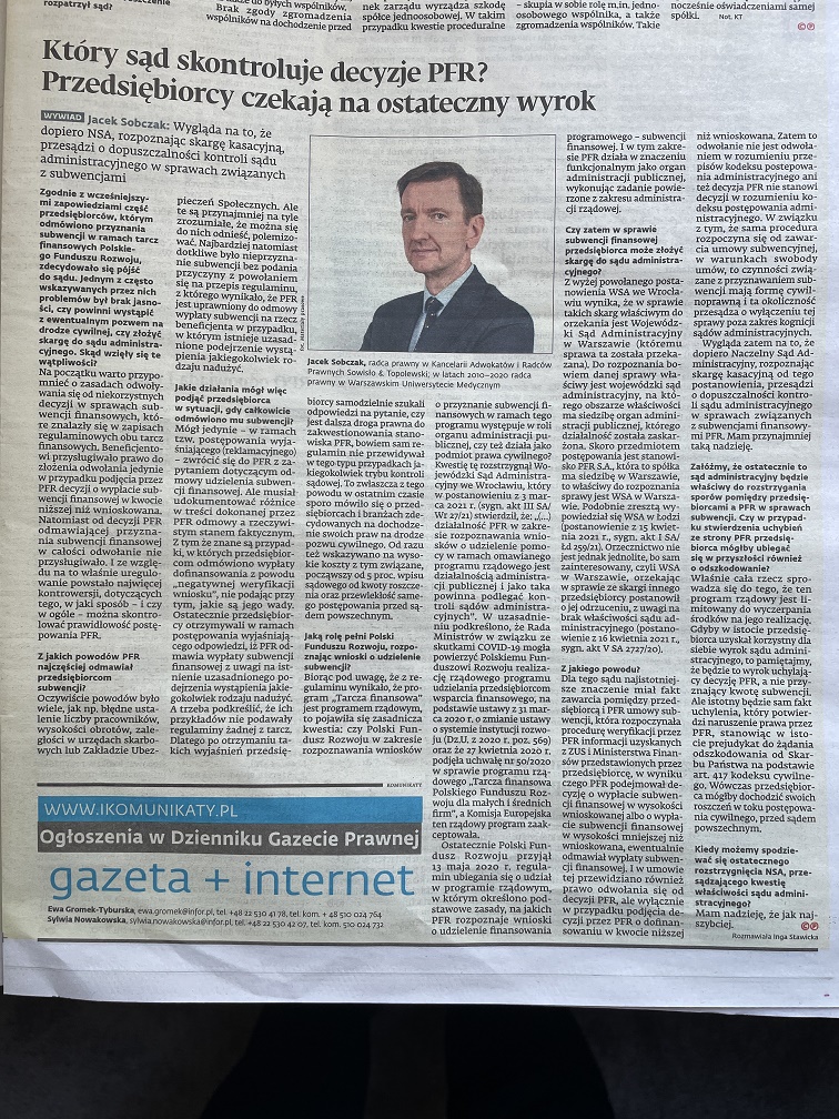 W dniu 29 czerwca 2021 roku „Dziennik Gazeta Prawna” zamieścił artykuł radcy prawnego Jacka Sobczaka pt.: „Który sąd skontroluje decyzje PFR ? Przedsiębiorcy czekają na ostateczny wyrok”.