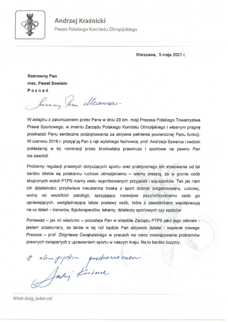 List Prezesa Polskiego Komitetu Olimpijskiego Andrzeja Kraśnickiego, profesora honoris causa Collegium Humanum do adwokata Pawła Sowisło, w związku z zakończeniem pełnienia funkcji Prezesa Zarządu Polskiego Towarzystwa Prawa Sportowego