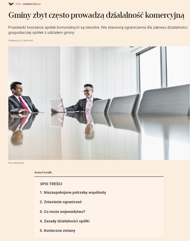 Artykuł analizuje problematykę działalności gospodarczej gmin, w szczególności w kontekście tworzenia spółek komunalnych. Czy samorządy powinny prowadzić działalność nastawioną na zysk? Czy ich działania mogą zaburzać konkurencję na rynku? Mecenas Fornalik przedstawia potrzebę zmian legislacyjnych w tym obszarze.