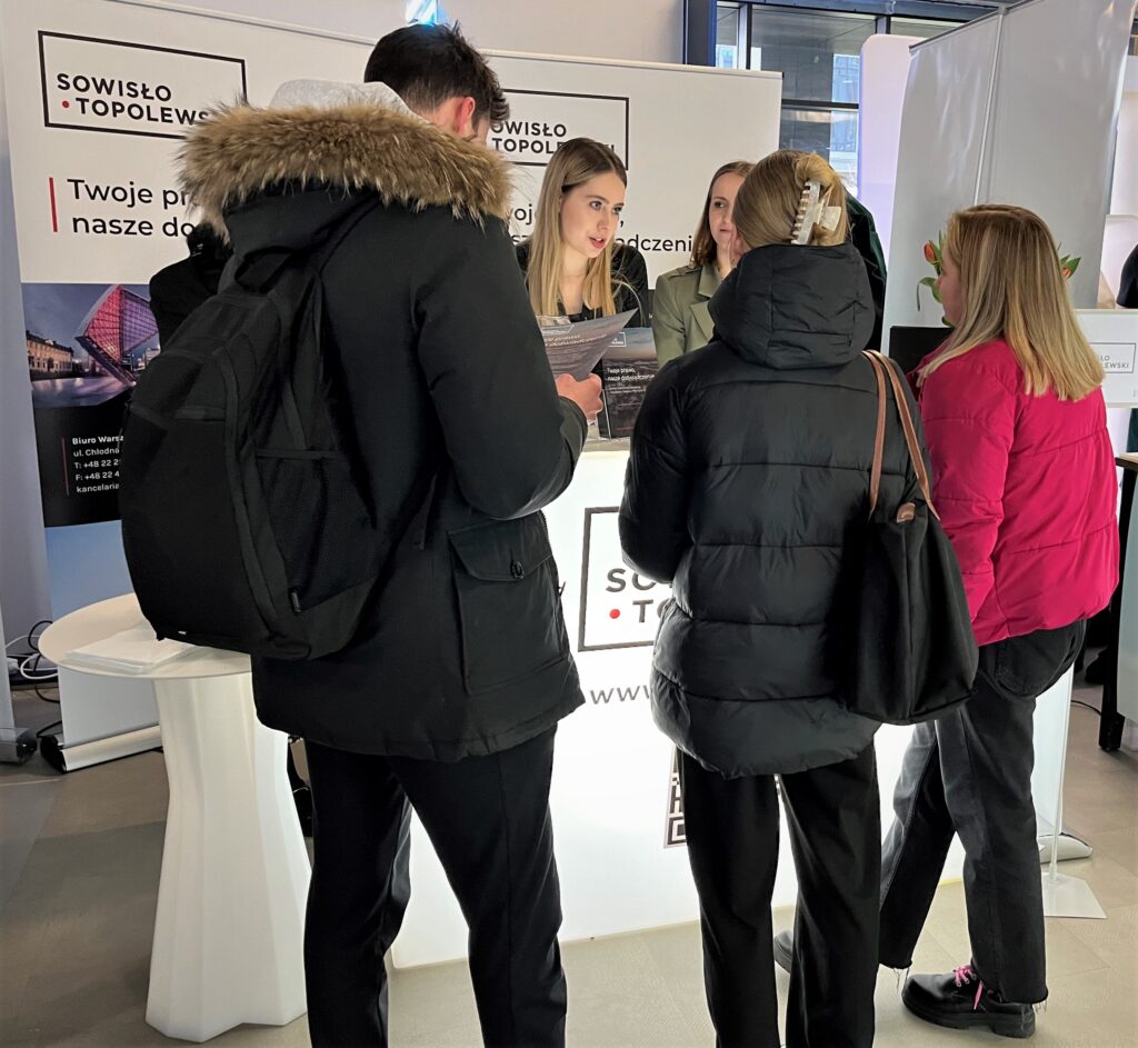 Podczas Targów przedstawiciele Kancelarii: adwokat Jan Dudzik, dyrektor HR Przemysław Dymarski, aplikantka adwokacka Aleksandra Nowak i aplikantka adwokacka Katarzyna Wrembel przekazywali odwiedzającym cenne informacje o procesie rekrutacyjnym, możliwościach rozwoju kariery, kogo i na jakie stanowiska aktualnie poszukujemy oraz jak wygląda praca prawnika w naszej Kancelarii.