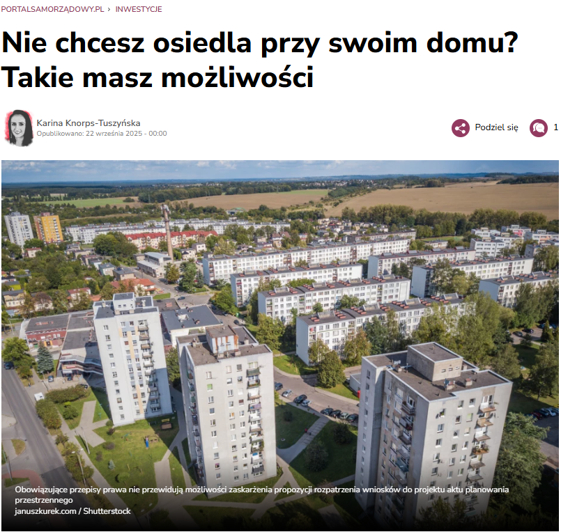 Nie chcesz, by tuż obok twojego domu powstało nowe osiedle? Co mogą zrobić mieszkańcy, którzy chcą realnie wpłynąć na decyzje gminy? W komentarzu dla Portal Samorządowy, adw. Aneta Fornalik, tłumaczy, jakie narzędzia mają obywatele – od udziału w konsultacjach po żądanie wykupu nieruchomości przez gminę. Jak podkreśla, władztwo planistyczne gminy nie jest nieograniczone i nie może być nadużywane kosztem mieszkańców.