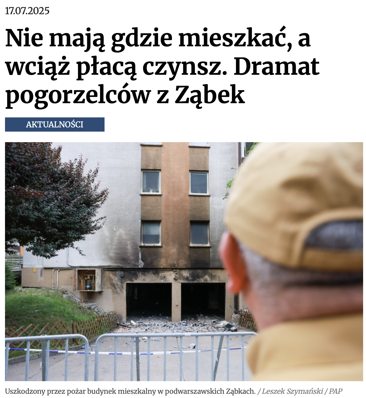W wyniku pożaru bloku w podwarszawskich Ząbkach wielu mieszkańców straciło swoje domy, ale mimo zniszczeń otrzymują od administracji naliczenia czynszu – nawet za lokale całkowicie zniszczone przez ogień. „Dostaliśmy nowe naliczenia opłat w wysokości 615 zł. To jest jakieś nieporozumienie i kpina! Na poddaszu, które spłonęło całkowicie, to chyba zmienił nam się metraż – mówi Zosia, która mieszkała wraz z rodzicami na trzecim piętrze w dwupoziomowym mieszkaniu.”
