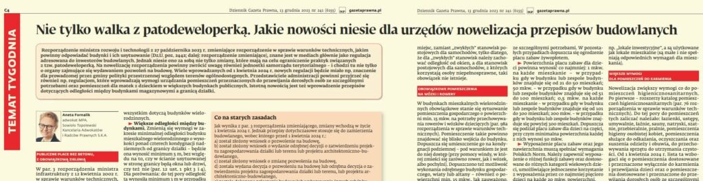 Dziennik Gazeta Prawna w swoim dodatku „Samorząd i Administracja” (nr 241) z dnia 13 grudnia 2023 r. opublikował artykuł „Nie tylko walka z patodeweloperką. Jakie nowości niesie dla urzędów nowelizacja przepisów budowlanych?” autorstwa adwokat Anety Fornalik.
