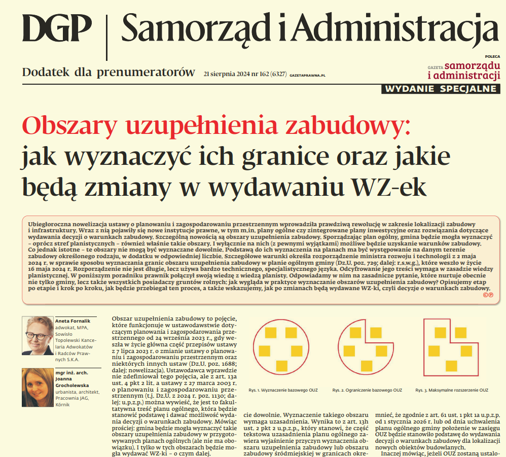 Dziennik Gazeta Prawna w swoim dodatku „Samorząd i Administracja” (nr 162) z dnia 21 sierpnia 2024 r. opublikował artykuł „Obszary uzupełnienia zabudowy: jak wyznaczyć ich granice oraz jakie będą zmiany w wydawaniu WZ-ek” autorstwa adwokat Anety Fornalik we współpracy z Joanną Grocholewską.