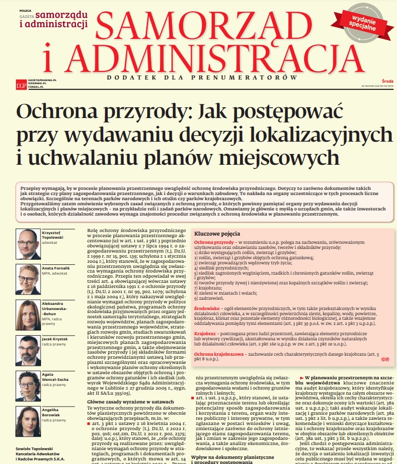„Dziennik Gazeta Prawna” w swoim dodatku „Samorząd i Administracja” nr 250 z dnia 28 grudnia 2022 roku zawarł obszerną publikację pt. „Ochrona przyrody: Jak postępować przy wydawaniu decyzji lokalizacyjnych i uchwalaniu planów miejscowych” autorstwa adwokata Krzysztofa Topolewskiego, adwokat Anety Fornalik, radcy prawnego Aleksandry Urbanowskiej-Bohun, radcy prawnego Jacka Krystka, radcy prawnego Agaty Wencel-Sochy oraz radcy prawnego Angeliki Borowiak. Redakcja tego dodatku została powierzona w całości prawnikom naszej Kancelarii.
