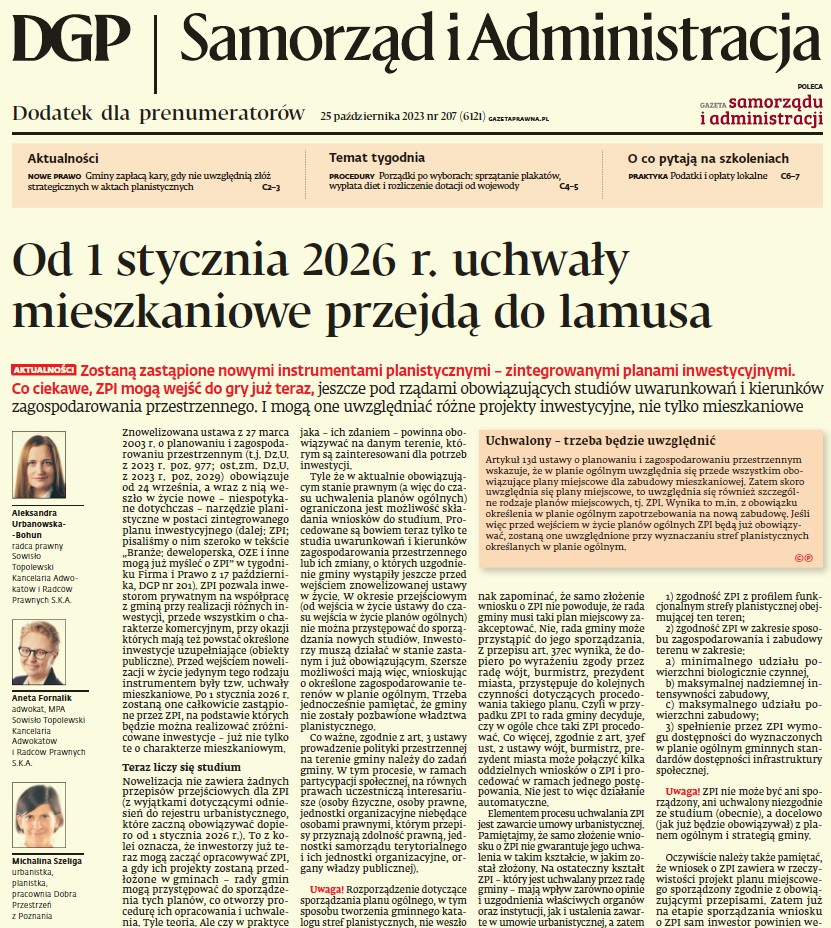 Dziennik Gazeta Prawna w swoim dodatku „Samorząd i Administracja” (nr 207) z dnia 25 października 2023 r. opublikował artykuł „Od 1 stycznia 2026 r. uchwały mieszkaniowe przejdą do lamusa” autorstwa naszych prawników: radcy prawnego Aleksandry Urbanowskiej-Bohun i adwokat Anety Fornalik oraz urbanistki Michaliny Szeligi.
