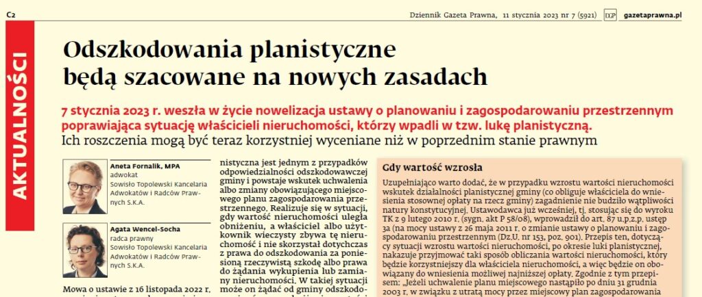 „Dziennik Gazeta Prawna” w swoim dodatku „Samorząd i Administracja” (nr 7) z dnia 11 stycznia 2023 roku opublikował artykuł adwokat Anety Fornalik i radcy prawnego Agaty Wencel-Sochy pt. „Odszkodowania planistyczne będą szacowane na nowych zasadach”.