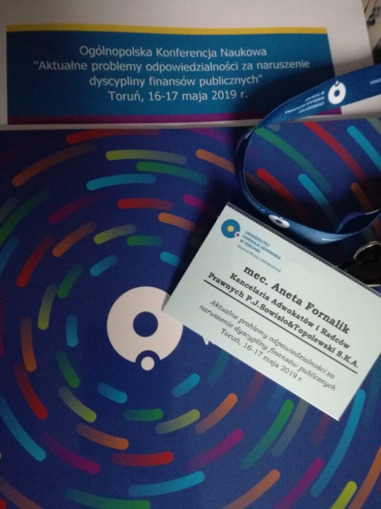 W dniach 16-17 maja 2019 r. w Toruniu odbyła się zorganizowana przez Uniwersytet Mikołaja Kopernika we współudziale z Głównym Rzecznikiem Dyscypliny Finansów Publicznych, Główną Komisją Orzekającą, Regionalną Izbą Obrachunkową w Bydgoszczy i Gminą Miasto Toruń Ogólnopolska Konferencja Naukowa pt. „Aktualne problemy odpowiedzialności za naruszenie dyscypliny finansów publicznych”, w której udział wzięła adwokat Aneta Fornalik, zajmująca się w Kancelarii problematyką związaną z finansami publicznymi i dyscypliną finansów publicznych.