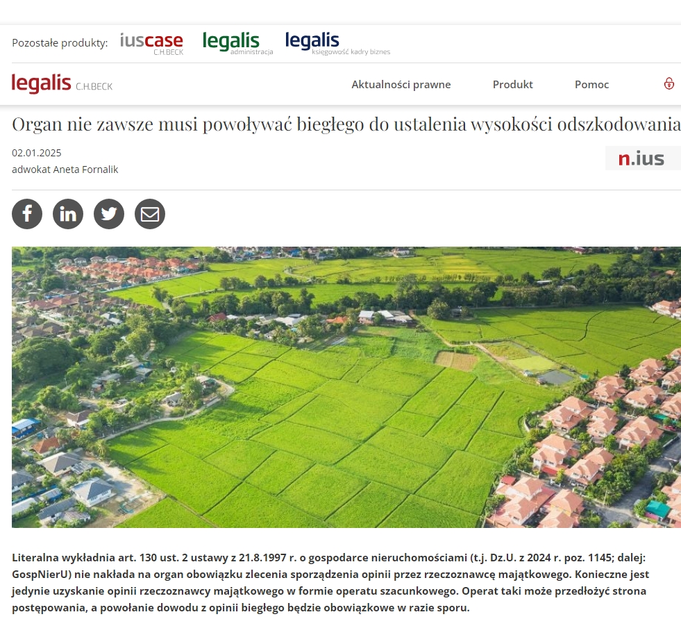 W dniu 2 stycznia 2025 r. w Serwisie Informacji Prawnej „Legalis” został opublikowany artykuł autorstwa adw. Anety Fornalik, w którym poruszono istotne zagadnienie związane z procedurą ustalania odszkodowań za wywłaszczone nieruchomości.