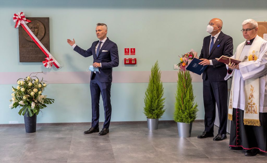 Następnie odsłonięto pamiątkową tablicę poświęconą właśnie dr Romanowi Grzeszczakowi, a po okolicznościowych przemówieniach wygłoszonych m.in. przez dyrektora szpitala, starostę, wicestarostę, syn dr Romana Grzeszczaka – Andrzej Grzeszczak dokonał symbolicznego otwarcia nowej części placówki.