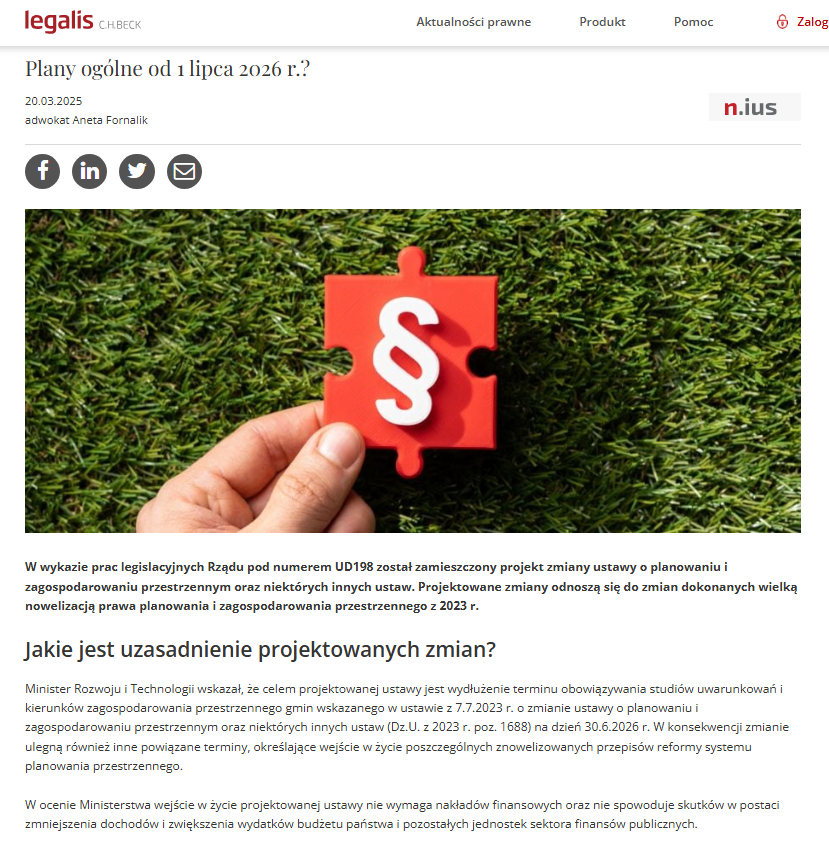 „Plany ogólne od 1 lipca 2026 r.?” – artykuł adw. Anety Fornalik w Systemie Informacji Prawnej Legalis