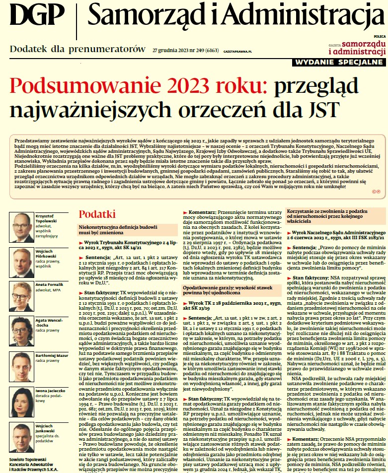 Link do wydania: https://serwisy.gazetaprawna.pl/samorzad/artykuly/9389506,najwazniejsze-orzeczenia-dla-jst-podsumowanie-2023-roku.html