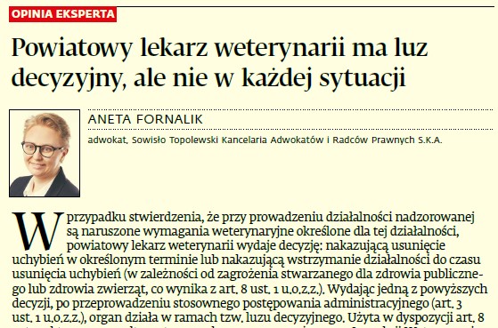 Dziennik Gazeta Prawna w swoim dodatku „Samorząd i Administracja” (nr 32) z dnia 14 lutego 2024 r. w artykule „Inspekcje weterynaryjne sprawdzą, czy schroniska dla zwierząt spełniają nowe wymogi” autorstwa red. Patrycji Otto opublikował komentarz adwokat Anety Fornalik „Powiatowy lekarz weterynarii ma luz decyzyjny, ale nie w każdej sytuacji”.