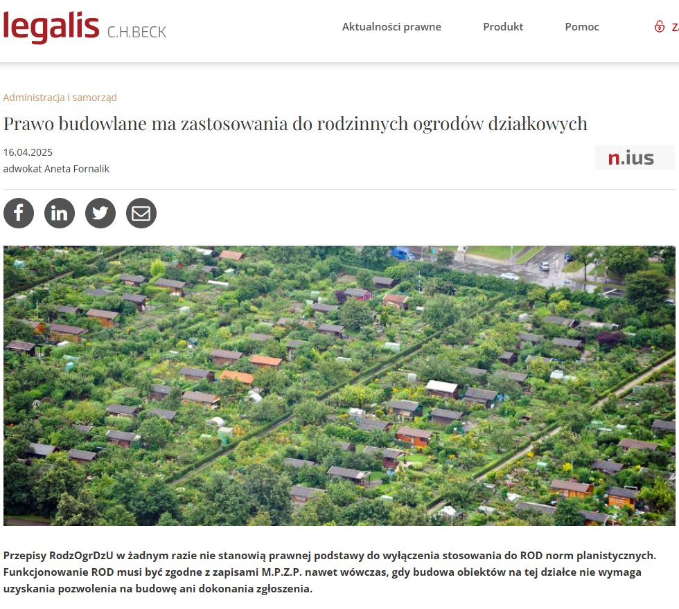 W Systemie Informacji Prawnej Legalis (Wydawnictwo C.H.Beck) ukazał się artykuł autorstwa adw. Anety Fornalik dotyczący zastosowania ustawy Prawa budowlane w kontekście rodzinnych ogrodów działkowych (ROD). Autorka analizuje, czy i w jakim zakresie przepisy ustawy odnoszą się do obiektów wznoszonych na terenie ROD, a także jakie konsekwencje prawne mogą wynikać z ich naruszenia.