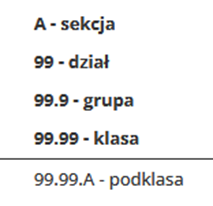 Dla wyjaśnienia warto przypomnieć, iż zgodnie z Rozporządzeniem Rady Ministrów z 24.12.2007 r. w sprawie Polskiej Klasyfikacji Działalności (PKD) PKD jest klasyfikacją pięciopoziomową i składa się z: poziom pierwszy sekcja, poziom drugi dział, poziom trzeci grupa, poziom czwarty klasa, poziom piąty podklasa, co obrazuje poniższa ilustracja: