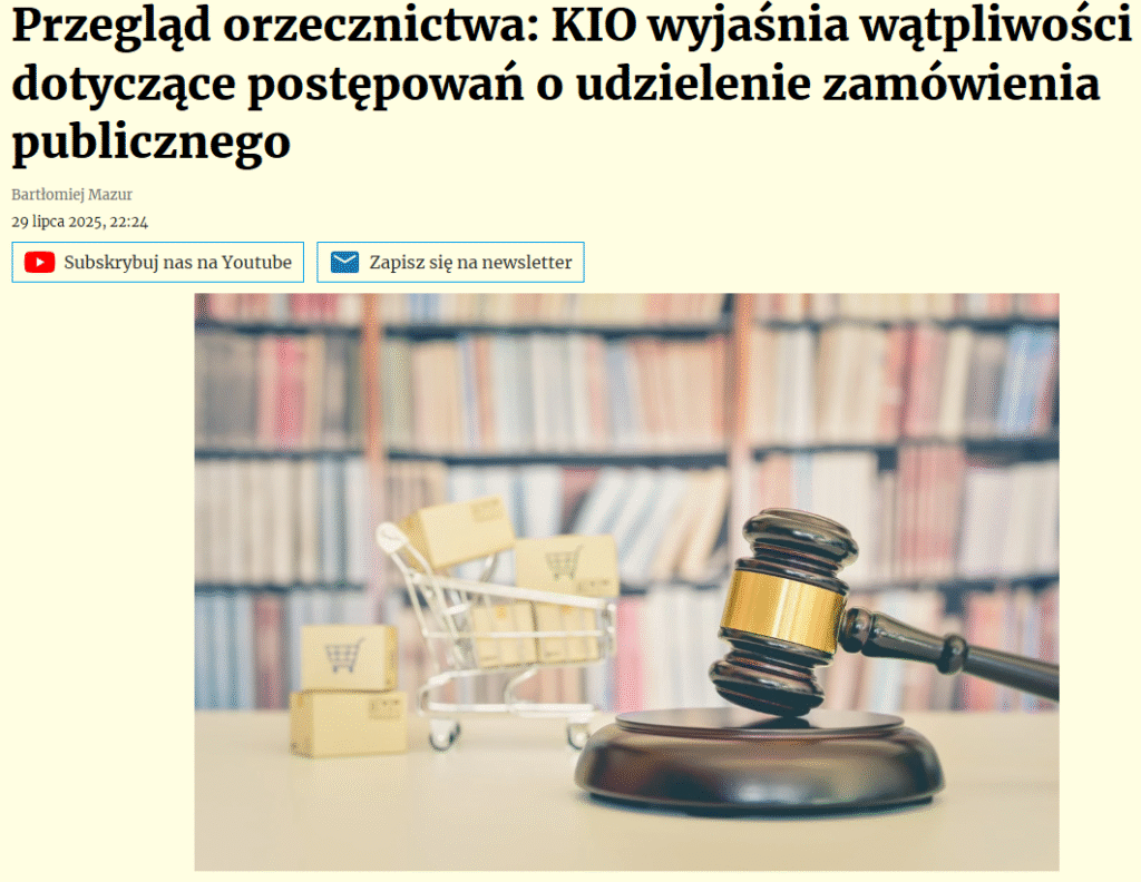 W artykule opublikowanym w Dzienniku Gazeta Prawna, r. pr. Bartłomiej Mazur analizuje najnowsze rozstrzygnięcia Krajowej Izby Odwoławczej. Opisuje m.in. stanowisko KIO w sprawie gwarancji wadialnych składanych przez konsorcja, wymaganej szczegółowości wyjaśnień dotyczących rażąco niskiej ceny oraz zakresu działań, jakie może podejmować zamawiający przy powtórzeniu czynności w toku postępowania.