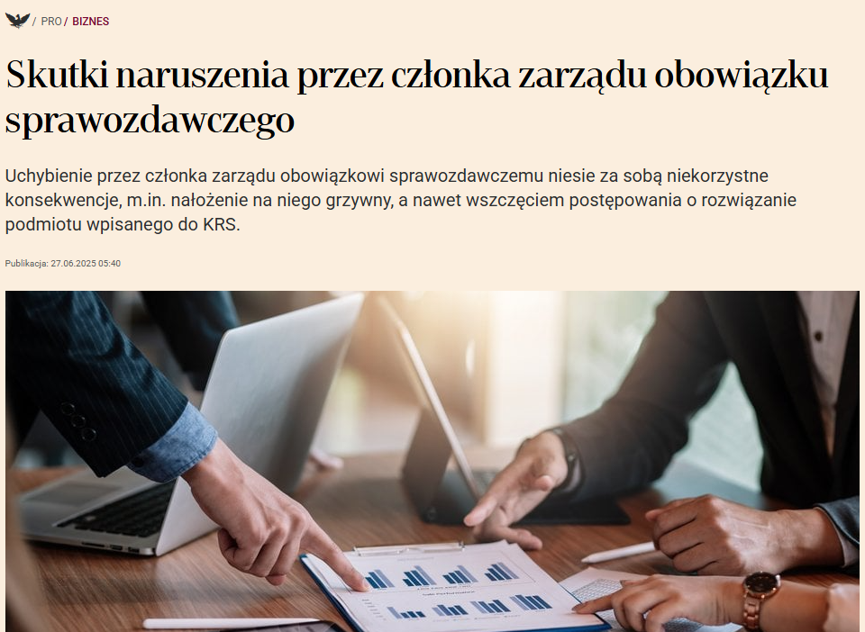 Uchybienie obowiązkowi sprawozdawczemu może mieć poważne konsekwencje – od grzywny aż po wszczęcie postępowania o rozwiązanie spółki wpisanej do KRS. R. pr. Magdalena Sobczak i apl. radc. Martyna Przytocka szczegółowo omawiają te zagadnienia w artykule opublikowanym na łamach dziennika Rzeczpospolita.