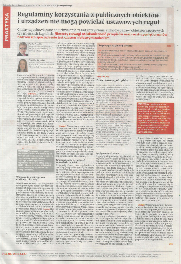 „Dziennik Gazeta Prawna” w swoim dodatku „Samorząd i Administracja” (nr 174/2021) opublikował artykuł adwokat Anety Fornalik i aplikant radcowskiej Angeliki Borowiak pt.: „Regulaminy korzystania z publicznych obiektów i urządzeń nie mogą powielać ustawowych reguł”.