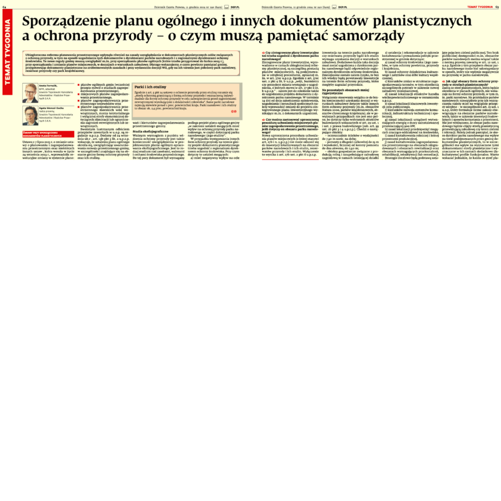 Adw. Aneta Fornalik wraz z r. pr. Agatą Wencel-Sochą w wydaniu Dziennika Gazeta Prawna z dnia 11 grudnia 2024 r., przedstawiają, jak gminy powinny dostosować swoje dokumenty planistyczne do nowych wymogów.
