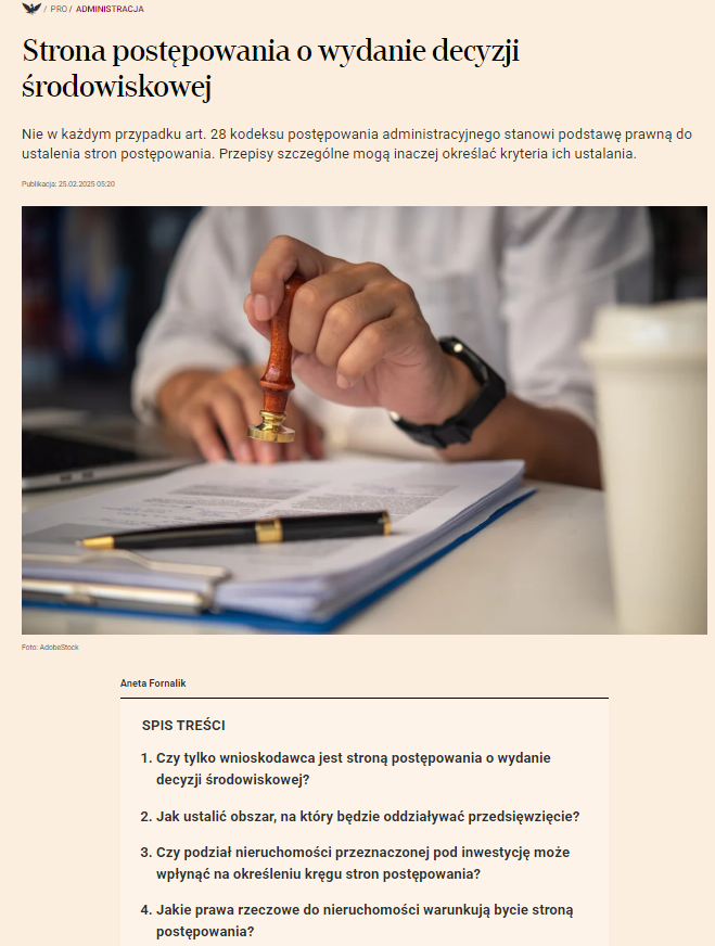 Najnowszy artykuł adw. Anety Fornalik w Rzeczpospolitej dotyczy ważnego tematu z zakresu ochrony środowiska — postępowania o wydanie decyzji środowiskowej. W artykule omówione są zagadnienia związane z rolą strony postępowania, jej uprawnieniami oraz obowiązkami, które wynikają z przepisów prawa ochrony środowiska. Autorka porusza również kwestie procedur administracyjnych oraz wpływu decyzji na realizację projektów inwestycyjnych.
