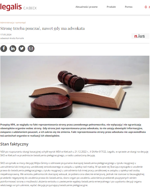 W dniu 17 maja 2024 r. System „Legalis” opublikował artykuł adw. Anety Fornalik „Stronę trzeba pouczać, nawet gdy ma adwokata” w zakładce Administracja i samorząd.