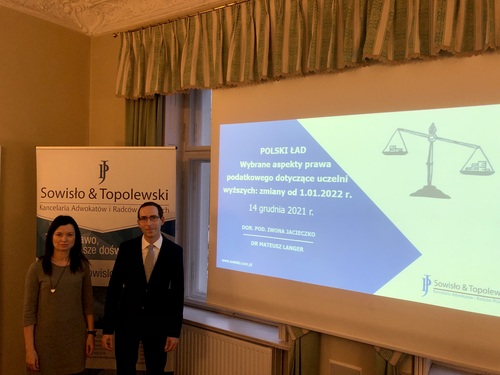 W trakcie szkolenia zostały poruszone newralgiczne zagadnienia podatkowe wynikające z uchwalenia „Polskiego Ładu” obejmujące m.in. zmianę sposobu opodatkowania pracowników uczelni wyższych, ulgę na prototyp, ulgę dla sponsorów oraz minimalny podatek dochodowy.